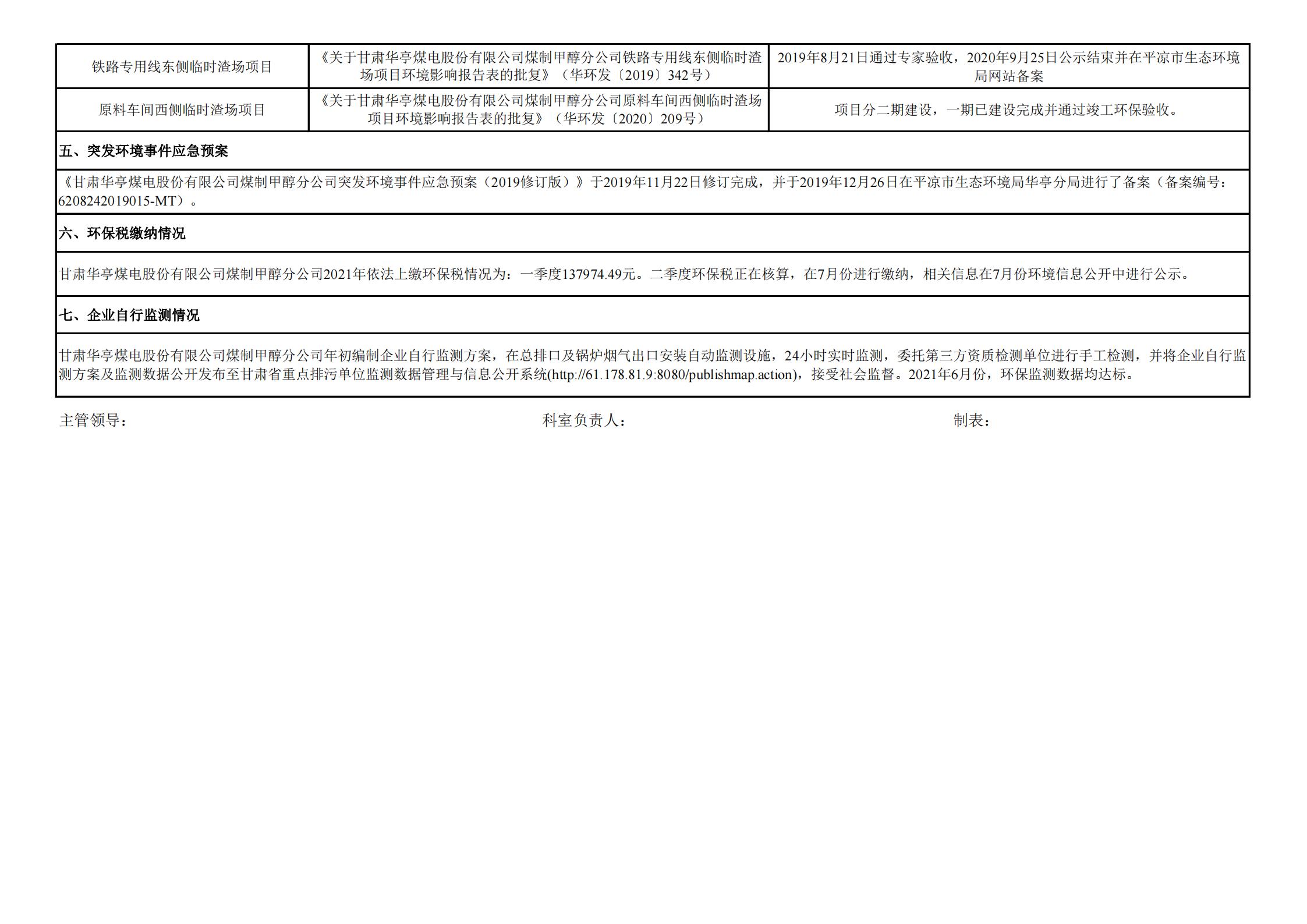 煤制甲醇分公司環(huán)境信息公開(kāi)內(nèi)容(2021年06月)